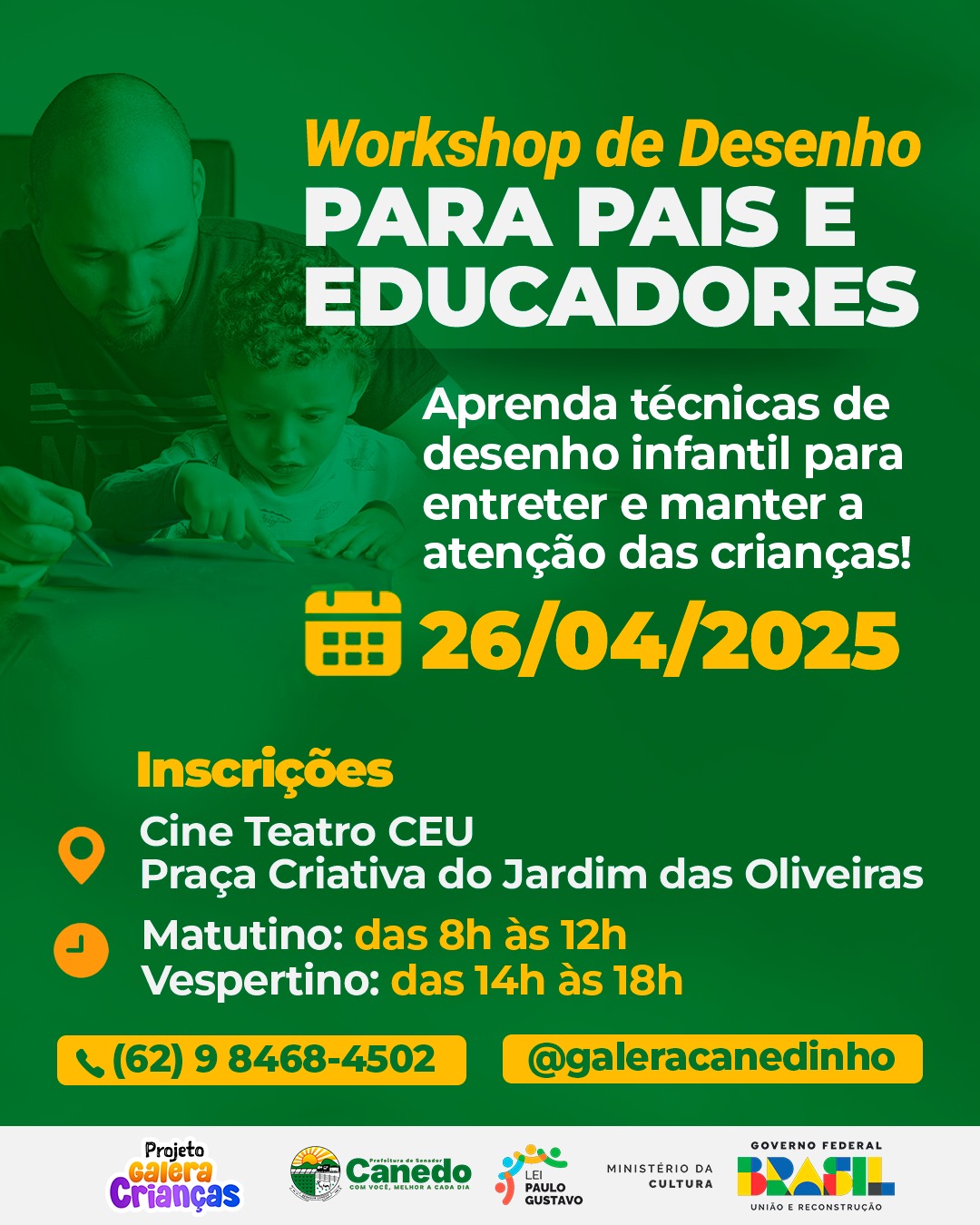 Os participantes devem levar uma prancheta tamanho A4, além de água e lanche individual. O projeto é uma realização da Oficina de Desenho Galera Canedinho e conta com o apoio da Prefeitura de Senador Canedo, por meio da Secretaria Municipal de Cultura (Secult), sendo viabilizado com recursos da Lei Paulo Gustavo, edital 002/2024, que busca valorizar nossa cultura, além de ajudar pais e educadores a fortalecer relações com nossos pequenos, garantindo a eles um futuro melhor.
