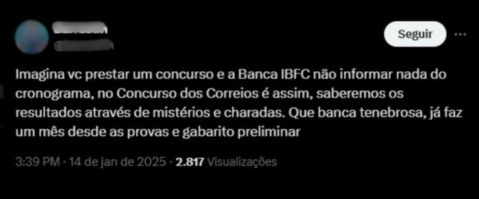 “Imagina você prestar um concurso e a Banca IBFC não informar nada do cronograma. No concurso dos Correios é assim, saberemos os resultados através de mistérios e charadas. Que banca tenebrosa, já faz um mês desde as provas e gabarito preliminar”, comenta outro candidato.