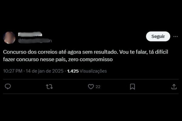 Outra usuária lamenta o descaso. “Concurso dos correios até agora sem resultado. Vou te falar, tá difícil fazer concurso nesse país, zero compromisso”, escreve.