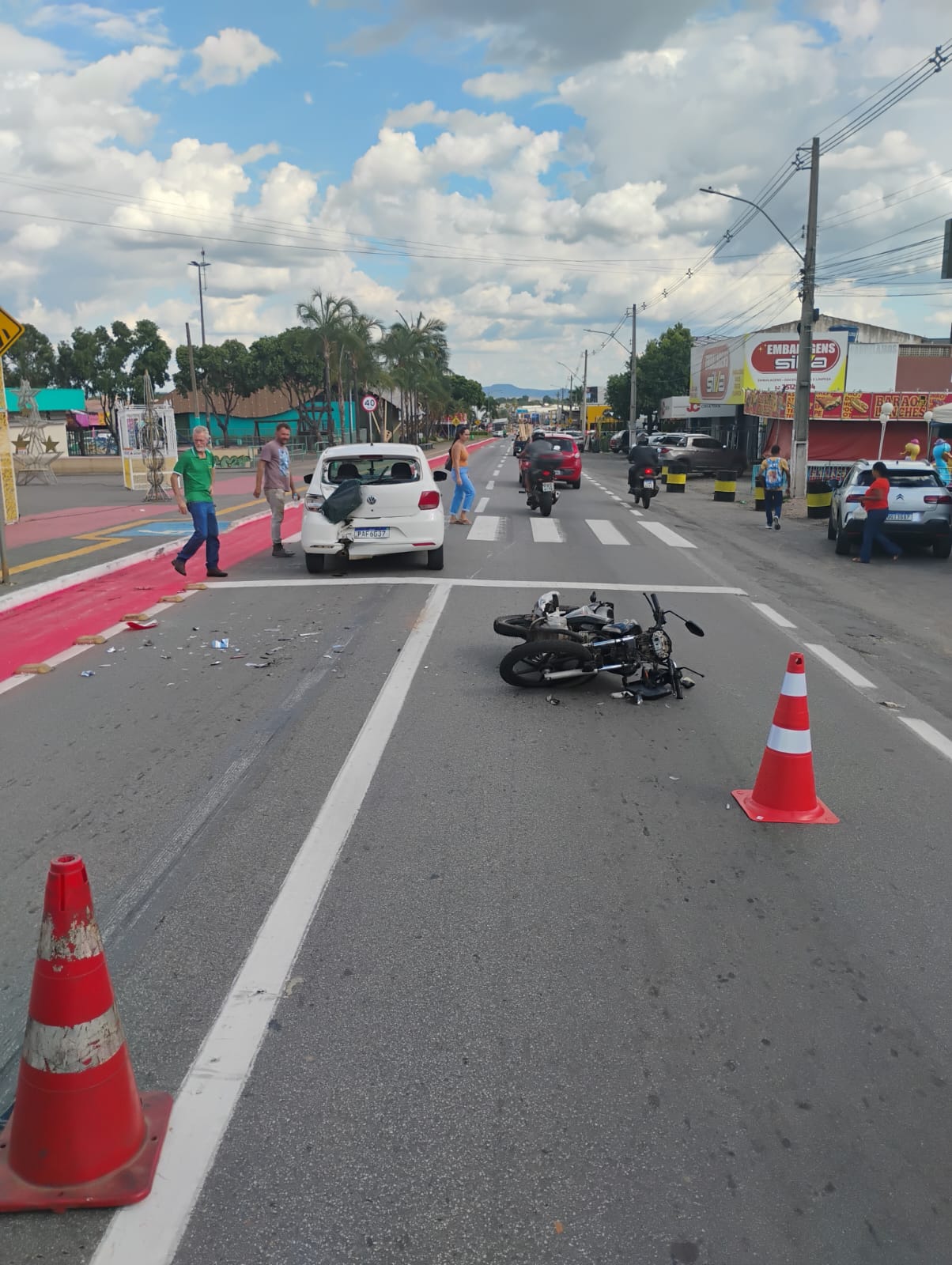Um acidente foi registrado na tarde de ontem na Praça Criativa Central, em Senador Canedo. O caso aconteceu quando um veículo reduziu a velocidade ao chegar na faixa de pedestres. Um motociclista, que seguia logo atrás e estaria distraído, não conseguiu frear a tempo e acabou colidindo na traseira do carro.