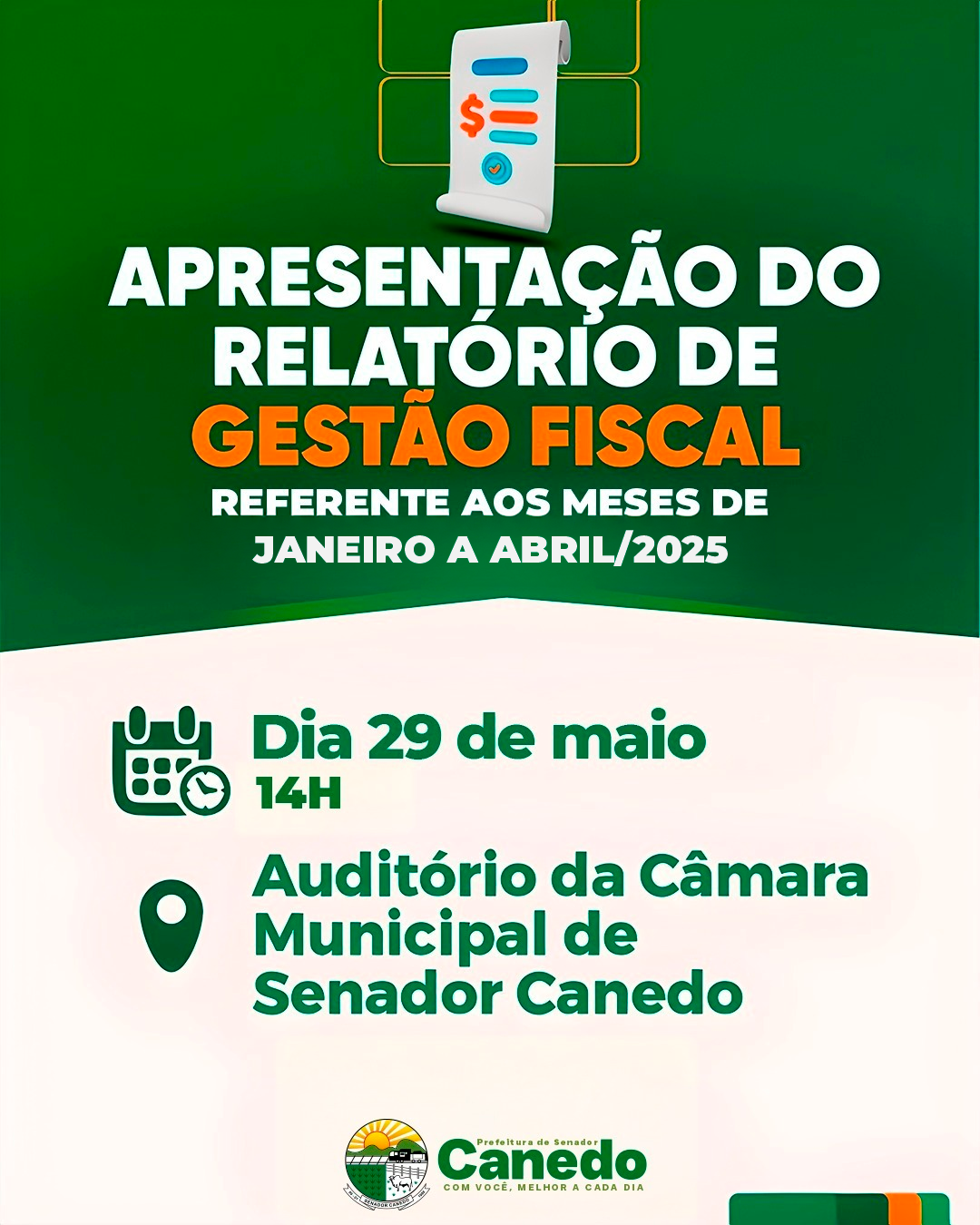 A Prefeitura de Senador Canedo realiza nesta quinta-feira, dia 29 de maio, às 14h, a apresentação do Relatório de Gestão Fiscal (RGF), um dos principais instrumentos de transparência previsto na Lei de Responsabilidade Fiscal (LRF).